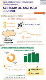 Esta infografía aporta una selección de indicadores del cuaderno "justicia juvenil" de la serie monográfica "Estado de la Infancia y Adolescencia en Andalucía" (2025) en la que se aborda el análisis del estado actual y la evolución de los niveles de bienestar y calidad de vida de la infancia y adolescencia en nuestra Comunidad Autónoma.