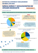 Esta infografía aporta una selección de indicadores del cuaderno "Niñas, niños y adolescentes de origen migrante" de la serie monográfica "Estado de la Infancia y Adolescencia en Andalucía" (2025) en la que se aborda el análisis del estado actual y la evolución de los niveles de bienestar y calidad de vida de la infancia y adolescencia en nuestra Comunidad Autónoma.